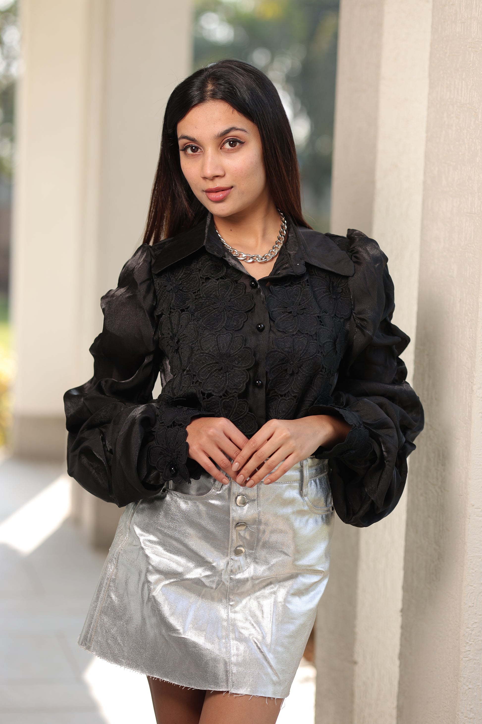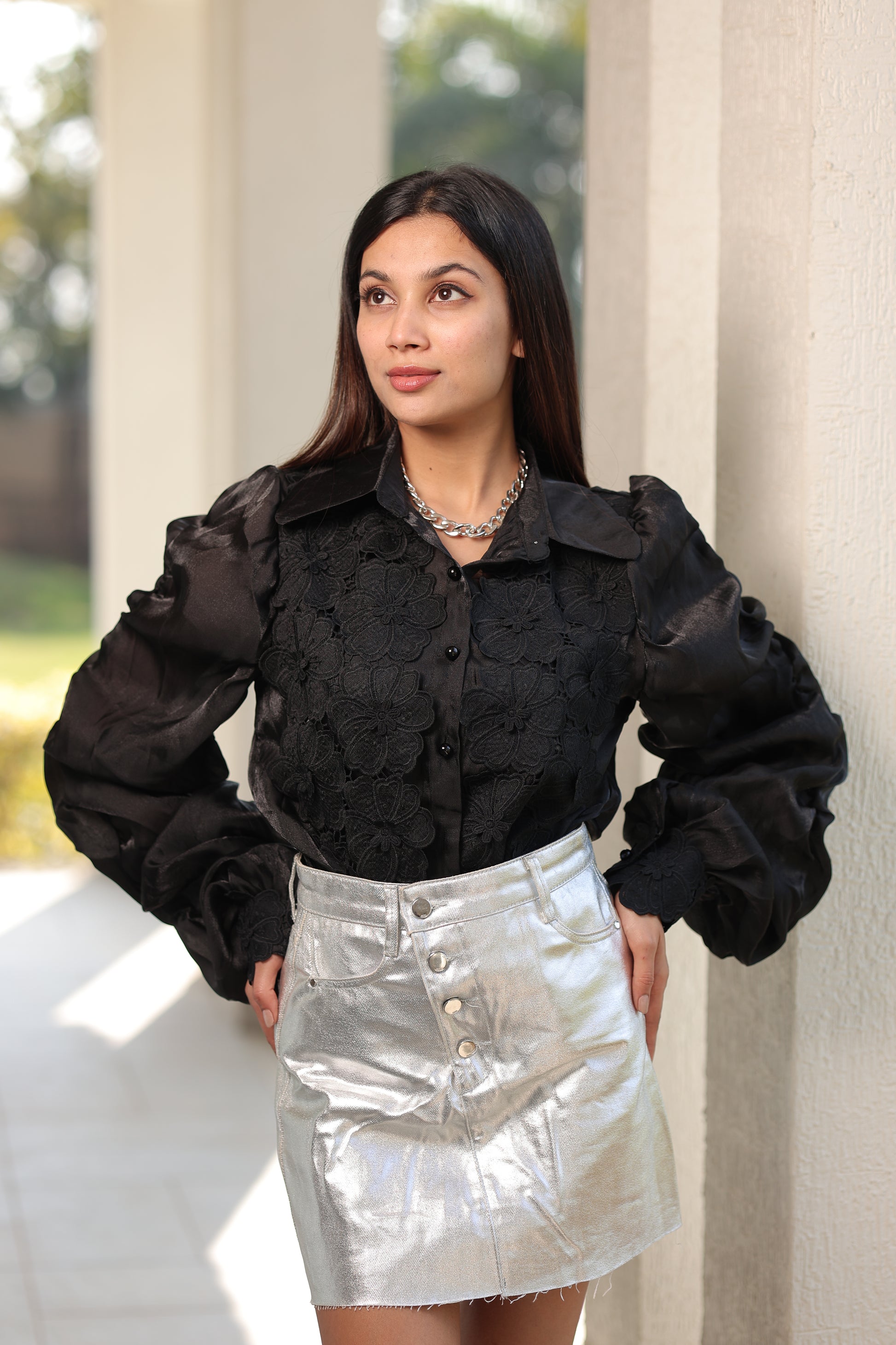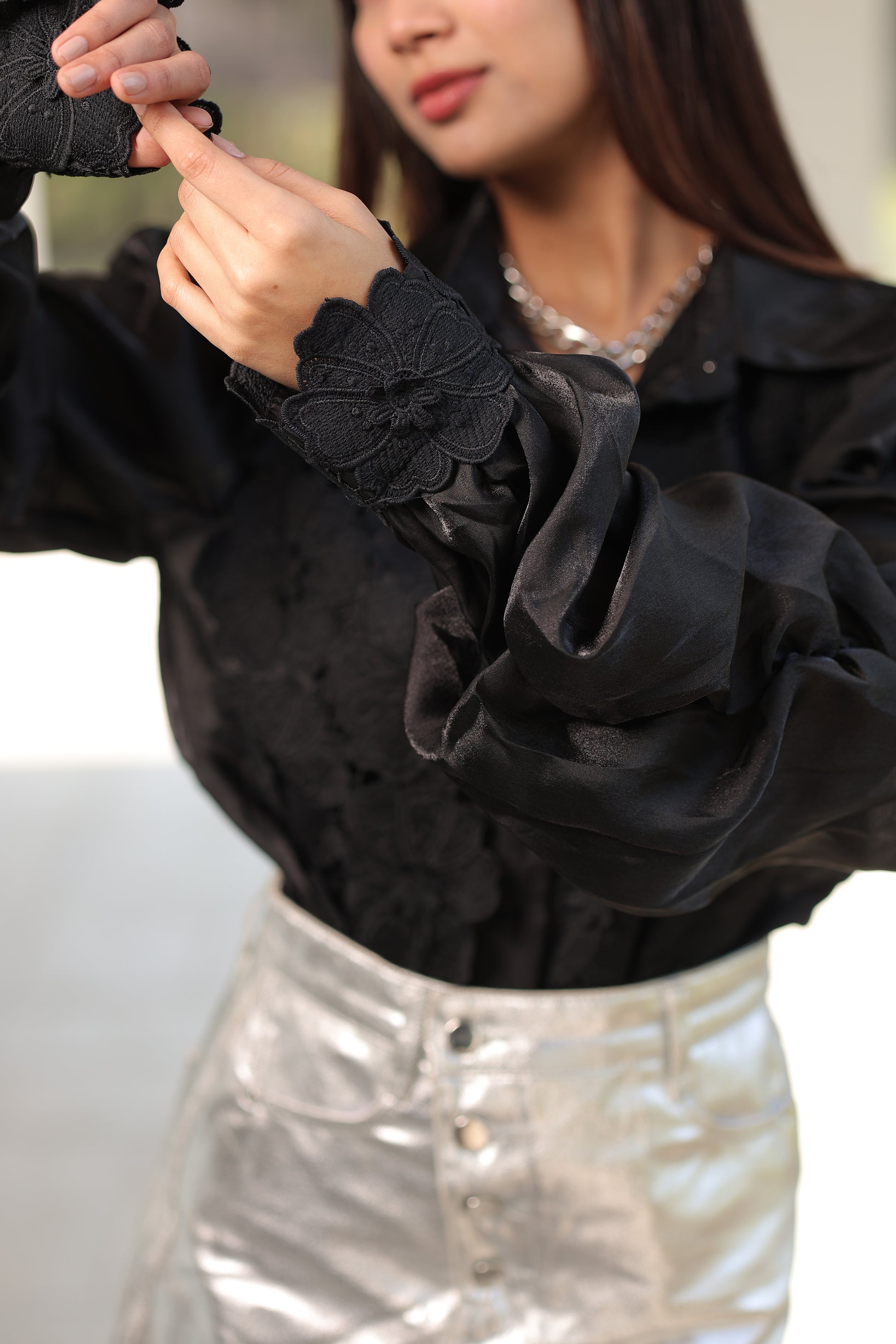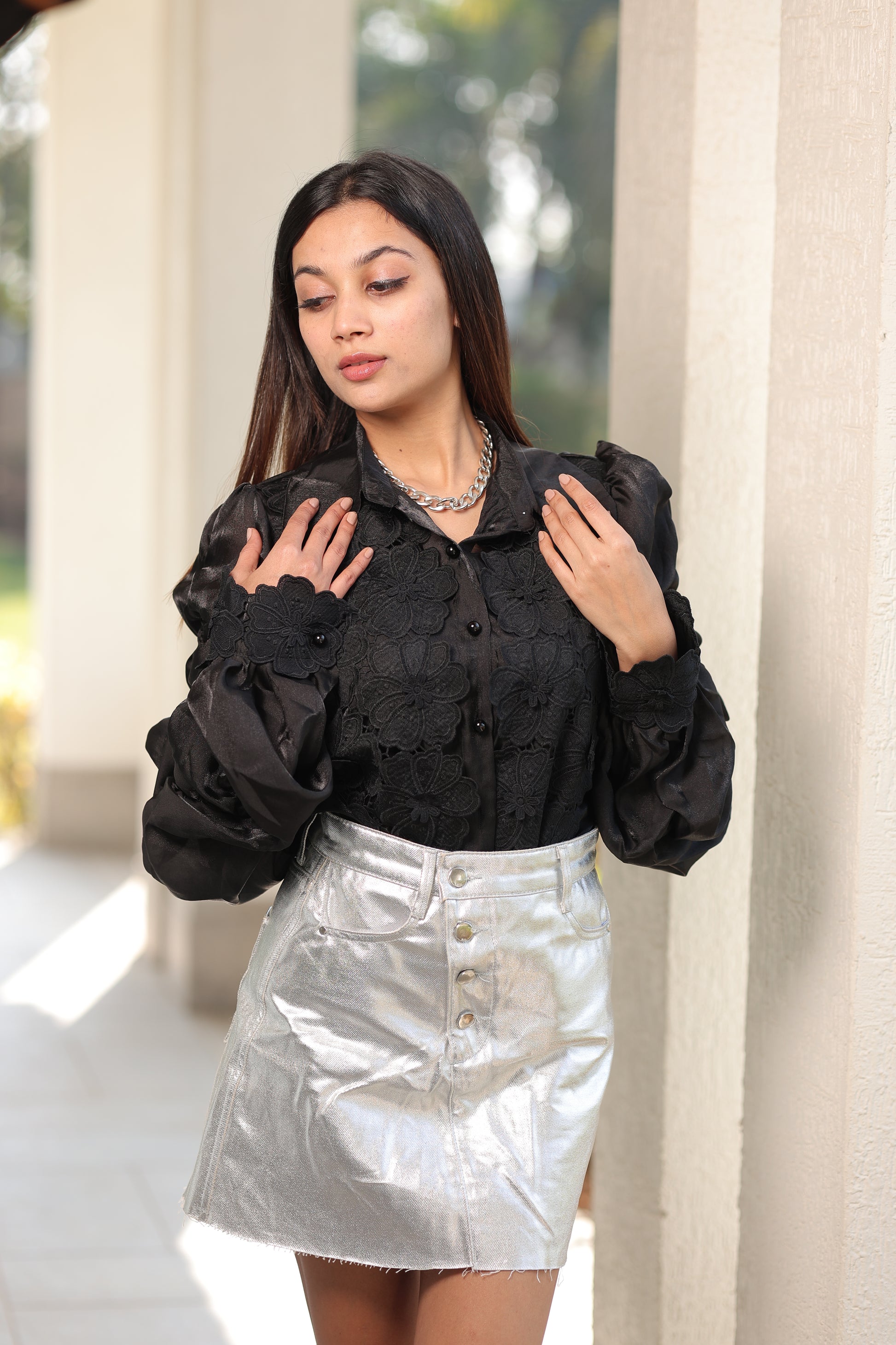 Top: Sleeves and bodice with intricate cutwork pattern, offering a feminine, statement and trendy festival as well as casual appeal.